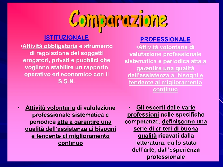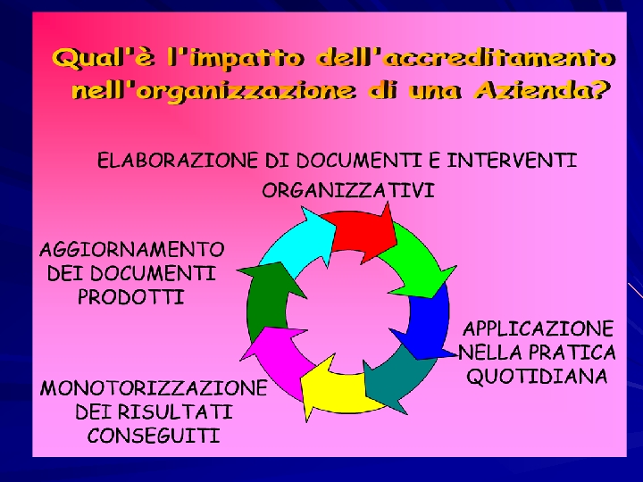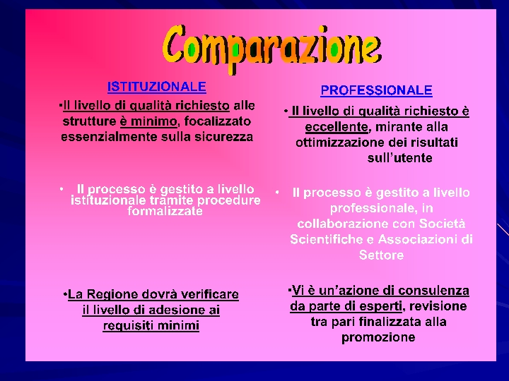 PARTECIPAZIONE ad un SISTEMA di ACCREDITAMENTO 1. Organismi accreditanti ufficialmente riconosciuti; 2. Standard di riferimento con il contributo delle Società Scientifiche; 3. Procedure codificate per l’Accreditamento; 4. Iniziative Istituzionali obbligatorie (orizzonte minimo); 5. Iniziative Professionali volontarie (miglioramento continuo, ridefinizione di standards più elevati, tensione verso l’eccellenza) QUALITA’ MINIMA QUALITA’ PROGRESSIVA