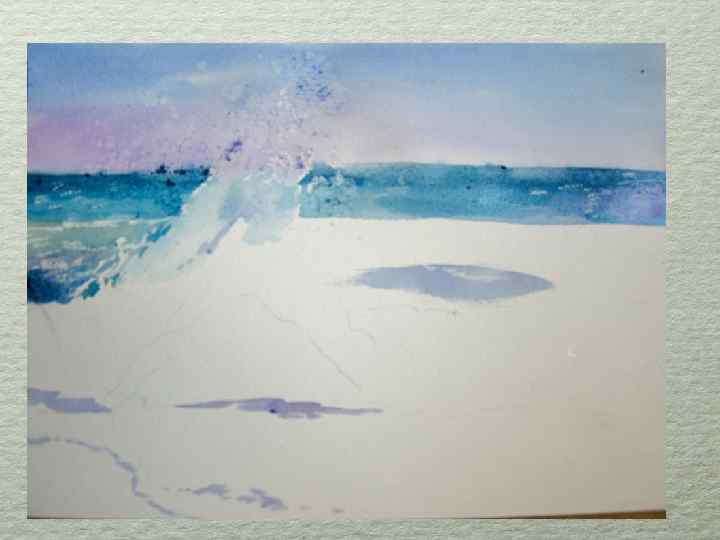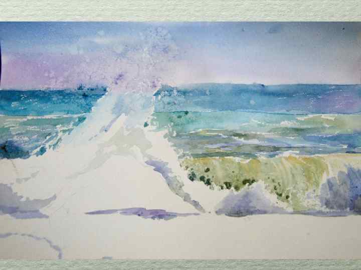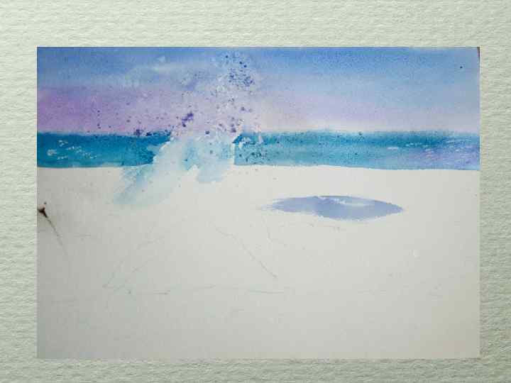 Работаем очень быстро. Мочим широкой кистью бумагу в районе неба. И пока вода не высохла, начинаем писать. Краски смешиваем на палитре. Я использовала берлинскую лазурь+лак синий+фиолето-розовую. Пока вода не высохла, на место брызг волн насыпаем соль.