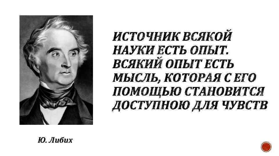ИСТОЧНИК ВСЯКОЙ НАУКИ ЕСТЬ ОПЫТ. ВСЯКИЙ ОПЫТ ЕСТЬ МЫСЛЬ, КОТОРАЯ С ЕГО ПОМОЩЬЮ СТАНОВИТСЯ ДОСТУПНОЮ ДЛЯ ЧУВСТВ Ю. Либих