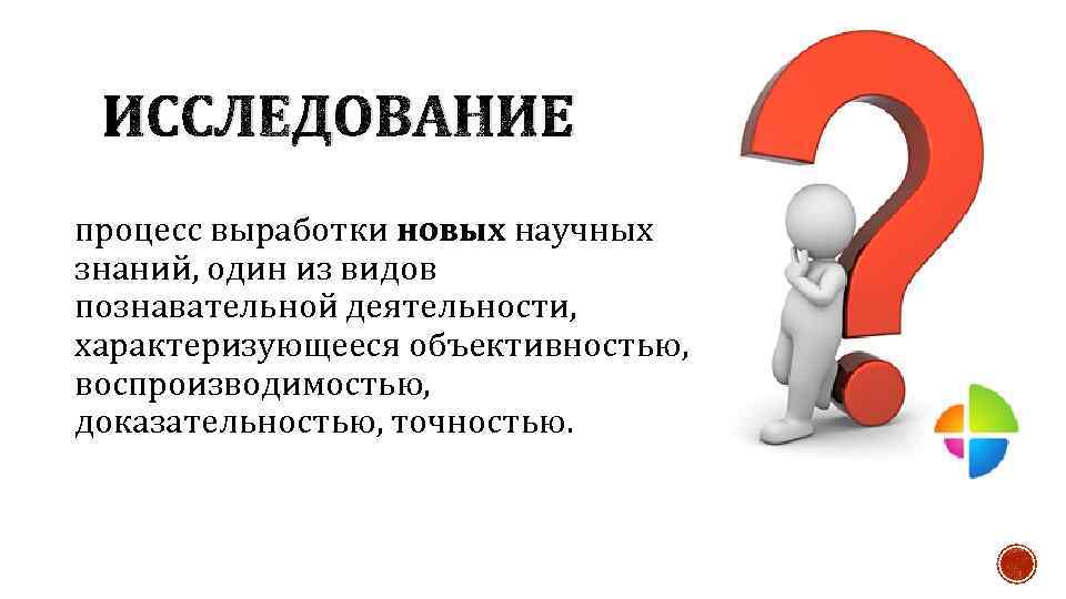ИССЛЕДОВАНИЕ процесс выработки новых научных знаний, один из видов познавательной деятельности, характеризующееся объективностью, воспроизводимостью, доказательностью, точностью.