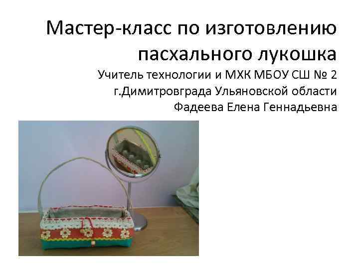 Мастер-класс по изготовлению пасхального лукошка Учитель технологии и МХК МБОУ СШ № 2 г. Димитровграда Ульяновской области Фадеева Елена Геннадьевна