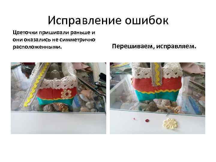 Исправление ошибок Цветочки пришивали раньше и они оказались не симметрично расположенными. Перешиваем, исправляем.