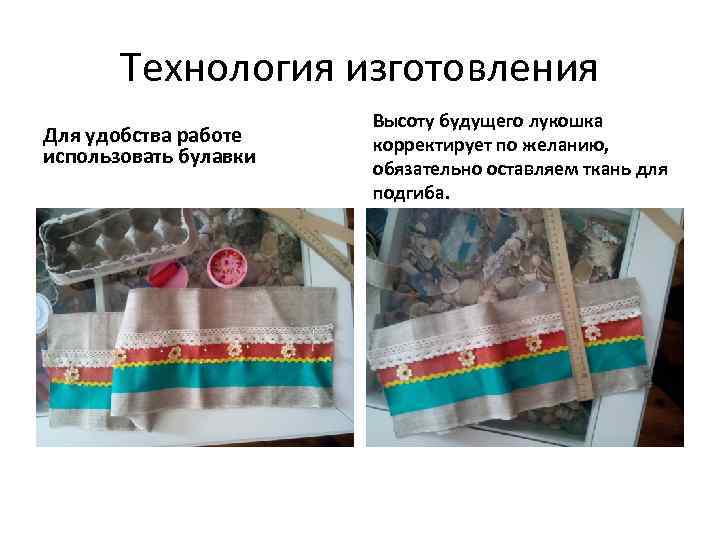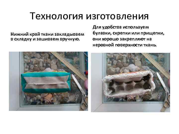 Технология изготовления Нижний край ткани закладываем в складку и зашиваем вручную. Для удобства используем булавки, скрепки или прищепки, они хорошо закрепляют на неровной поверхности ткань.
