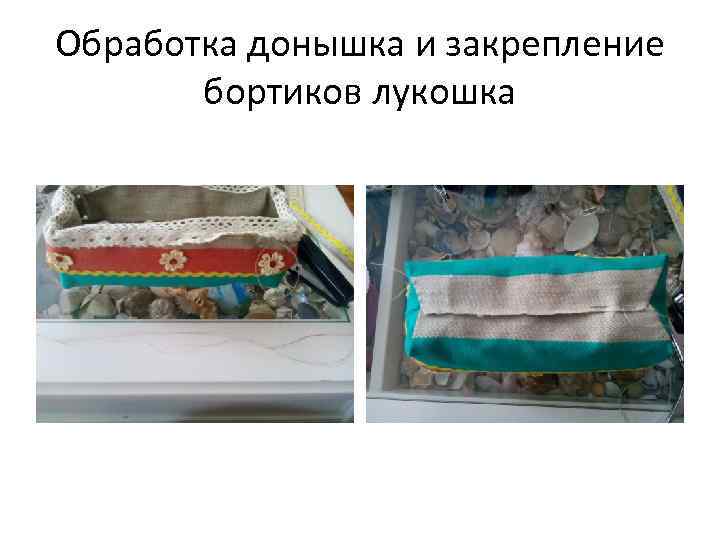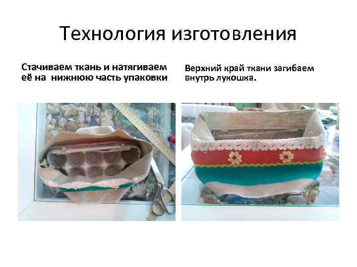 Технология изготовления Стачиваем ткань и натягиваем её на нижнюю часть упаковки Верхний край ткани загибаем внутрь лукошка.