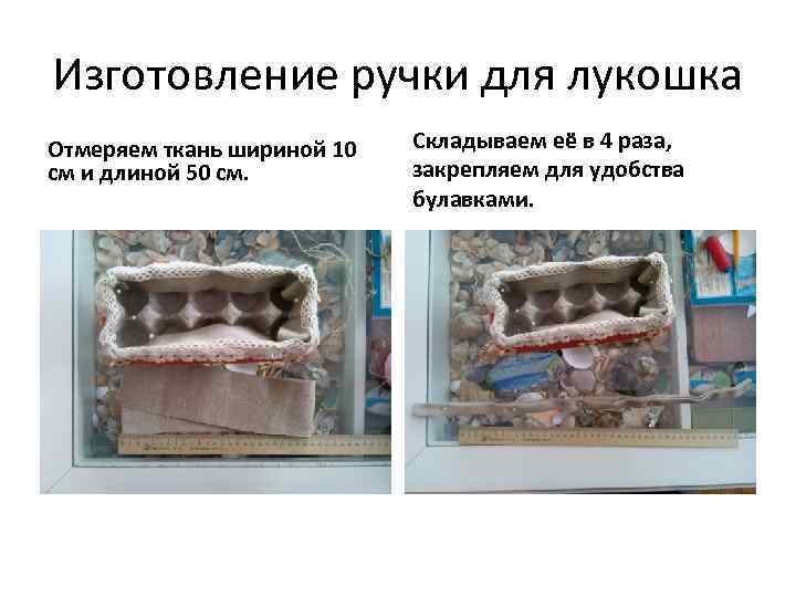 Изготовление ручки для лукошка Отмеряем ткань шириной 10 см и длиной 50 см. Складываем её в 4 раза, закрепляем для удобства булавками.