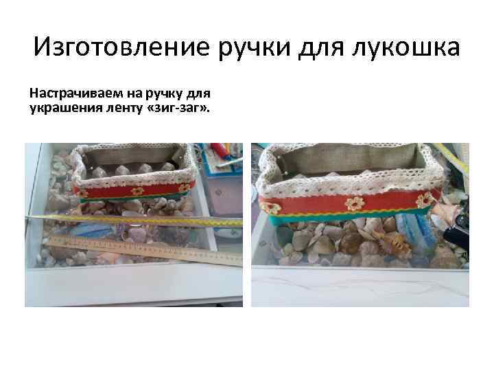 Изготовление ручки для лукошка Настрачиваем на ручку для украшения ленту «зиг-заг» .