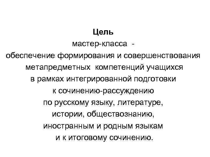 Цель мастер-класса обеспечение формирования и совершенствования метапредметных компетенций учащихся в рамках интегрированной подготовки к сочинению-рассуждению по русскому языку, литературе, истории, обществознанию, иностранным и родным языкам и к итоговому сочинению.