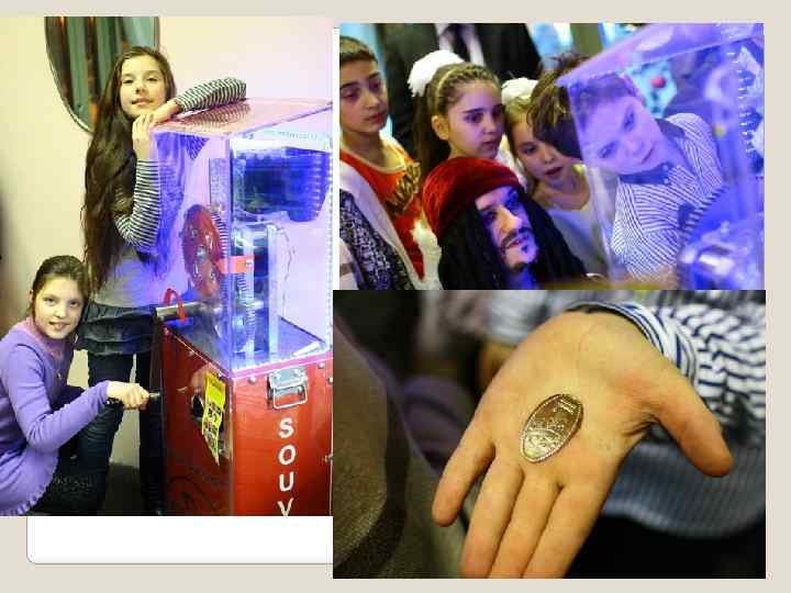 Шоу – программа «Чеканка монет» Увлекательный аппарат-атракцион под названием «Пресс-сувенир» позволяет своими собственными руками расплющить монету номиналом 50 копеек и получить красивый медальон с изображением ангела «С любовью» , подковы «На счастье» , «Медный всадник» , «Дворцовый мост»
