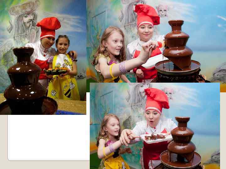 Шоу – программа «Шоколадный фонтан» Шоколадный фонтан - это шикарное, запоминающееся зрелище, это удивительно вкусный десерт. Не только ребенок, но и взрослый человек обязательно запомнит эту необыкновенную картину! Ну а самое интересное - это процесс самостоятельного изготовления самого вкусного десерта. Для этого необходимо взять шпажку и одеть на нее кусочки свежих фруктов - горячий шоколад хорошо сочетается с мандарином, яблоком, ананасом, грушей, бананом, виноградом. . . также можно использовать сухофрукты, например, курагу, чернослив, райские яблочки. . . Затем такой фруктовый шашлык - подставляем под шоколадный водопад и тем самым глазируем кусочки фруктов в шоколаде! Аромат разносится необычайный - теплый, сладкий, шоколадный. . . Вкусно, полезно, зрелищно! В Детском Кафе ЗОЛУШКА вас порадует изобилие свежих фруктов и сухофруктов, а также разнообразие всевозможных присыпок кокосовая стружка, орешки, семечки. Производство своего собственного десерта доставит и взрослым и детям колоссальное удовольствие и поможет применить безграничную фантазию!