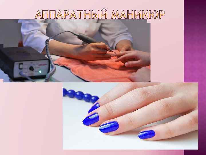 Аппаратный маникюр — это маникюр, производимый не только руками мастера, но и с помощью специального оборудования для аппаратного маникюра. Основным достоинством аппаратного маникюра является то, что он абсолютно нетравматичен: т. е. риск повреждения, а тем более заражения тканей, во время маникюра исключен априори. Оборудование для аппаратного маникюра представляет собой эдакий толстый «фломастер» с проводом на одном конце и шустро вращающимися алмазными и другими шлифовальными малюсенькими насадочками — на другом. Аппаратный маникюр полезен не только для людей, с «проблемными» ногтями, но и для деликатной, нетравматичной коррекции искусственных ногтей, наращенных гелем или акрилом