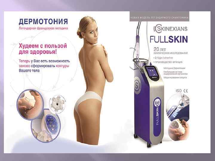 Дермотония ДЛЯ ЛИЦА • Восстановление овала лица • Повышение тонуса кожи • Устранение мелких морщин • Снятие отечности ДЛЯ ТЕЛА • Лечение целлюлита • Уменьшение объема • Повышение тонуса кожи • Уменьшение растяжек и рубцов МЕДИЦИНА § Реабилитация после пластических операций