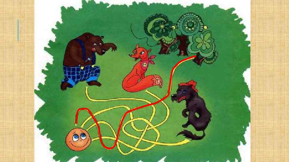 ! РЕШИЛ КОЛОБОК ИГРОВОЕ УПРАЖНЕНИЕ И ПОКАТИЛСЯ СЕБЕ ДАЛЬШЕ; ТОЛЬКО ЗАЯЦ ЕГО И ВИДЕЛ! КАТИТСЯ КОЛОБОК, А НАВСТРЕЧУ ЕМУ ВОЛК: «КОЛОБОК, КОЛОБОК! Я ТЕБЯ СЪЕМ!» «Не ешь меня, серый волк! Я тебе песенку спою!» : Я Колобок, Колобок! В математике силён; Я от дедушки ушел, Я от бабушки ушел, Я от зайца ушел, И от тебя, волка, не хитро уйти. ХОРОШО, ОТПУЩУ ТЕБЯ ЕСЛИ ПОИГРАЕШЬ В МОЮ ЛЮБИМУЮ ИГРУ «НАЙДИ ДОМИК» .