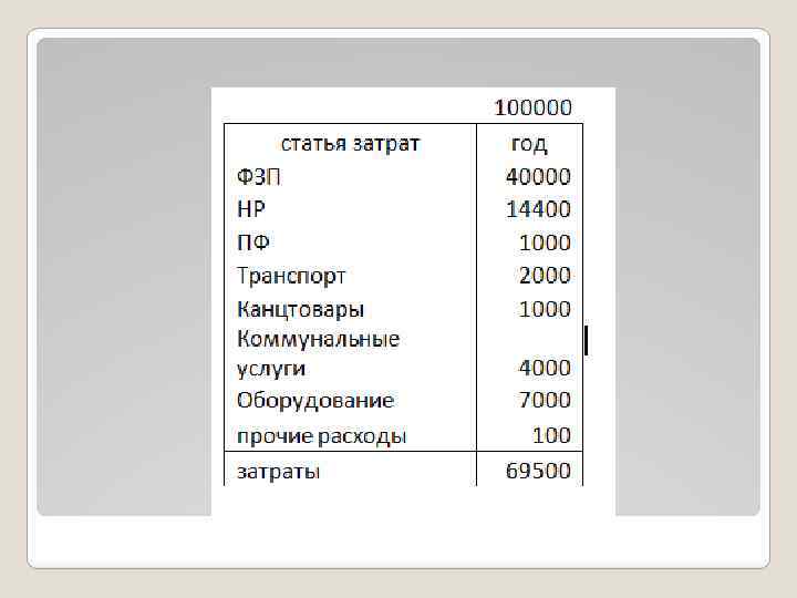 Годовая смета • Мы составляли годовую смету. • Алгоритм: • Нам были даны средства: 100000 и статьи затрат, задающиеся процентом данных средств: Фонд Заработной Платы(40 -50%), Накладные расходы (36% от ФЗП), ПФ(1%) а также статьи которые могут задаваться произвольно: Транспорт, Канцтовары, Коммунальные услуги, Оборудование, Прочие расходы. • «Затраты» подсчитываются как сумма всех статей затрат, а «прибыль» как разность данных средств и «затрат»