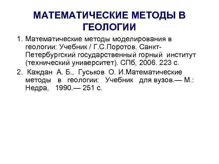 МАТЕМАТИЧЕСКИЕ МЕТОДЫ В ГЕОЛОГИИ 1. Математические методы моделирования в геологии: Учебник / Г. С. Поротов. Санкт. Петербургский государственный горный институт (технический университет). СПб, 2006. 223 с. 2. Каждан А. Б. , Гуськов О. И. Математические методы в геологии: Учебник для вузов. — М. : Недра, 1990. — 251 с.