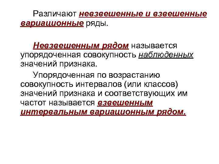 Различают невзвешенные и взвешенные вариационные ряды. Невзвешенным рядом называется упорядоченная совокупность наблюденных значений признака. Упорядоченная по возрастанию совокупность интервалов (или классов) значений признака и соответствующих им частот называется взвешенным интервальным вариационным рядом.