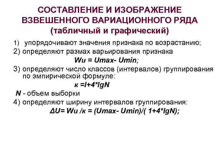 СОСТАВЛЕНИЕ И ИЗОБРАЖЕНИЕ ВЗВЕШЕННОГО ВАРИАЦИОННОГО РЯДА (табличный и графический) 1) упорядочивают значения признака по возрастанию; 2) определяют размах варьирования признака Wu = Umax- Umin; 3) определяют число классов (интервалов) группирования по эмпирической формуле: к =l+4*lg. N N - объем выборки 4) определяют ширину интервалов группирования: ΔU= Wu /к = (Umax- Umin)/( 1+4*lg. N);
