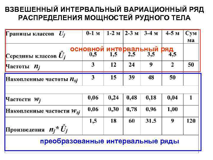 ВЗВЕШЕННЫЙ ИНТЕРВАЛЬНЫЙ ВАРИАЦИОННЫЙ РЯД РАСПРЕДЕЛЕНИЯ МОЩНОСТЕЙ РУДНОГО ТЕЛА основной интервальный ряд преобразованные интервальные ряды