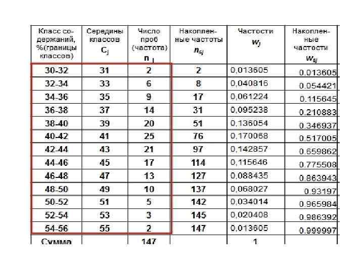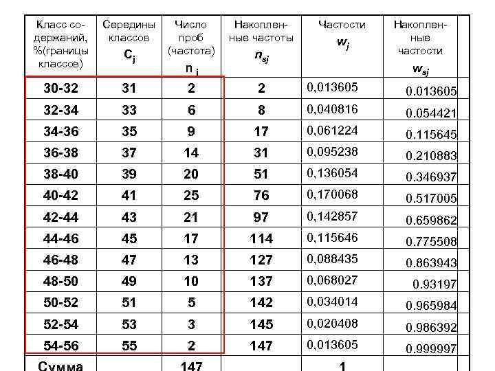 Класс содержаний, %(границы классов) Середины классов 30 -32 31 2 2 0, 013605 0. 013605 32 -34 33 6 8 0, 040816 0. 054421 34 -36 35 9 17 0, 061224 0. 115645 36 -38 37 14 31 0, 095238 0. 210883 38 -40 39 20 51 0, 136054 0. 346937 40 -42 41 25 76 0, 170068 0. 517005 42 -44 43 21 97 0, 142857 0. 659862 44 -46 45 17 114 0, 115646 0. 775508 46 -48 47 13 127 0, 088435 0. 863943 48 -50 49 10 137 0, 068027 0. 93197 50 -52 51 5 142 0, 034014 0. 965984 52 -54 53 3 145 0, 020408 0. 986392 54 -56 55 2 147 0, 013605 0. 999997 Cj Число проб (частота) nj Накопленные частоты nsj Частости wj Накопленные частости wsj
