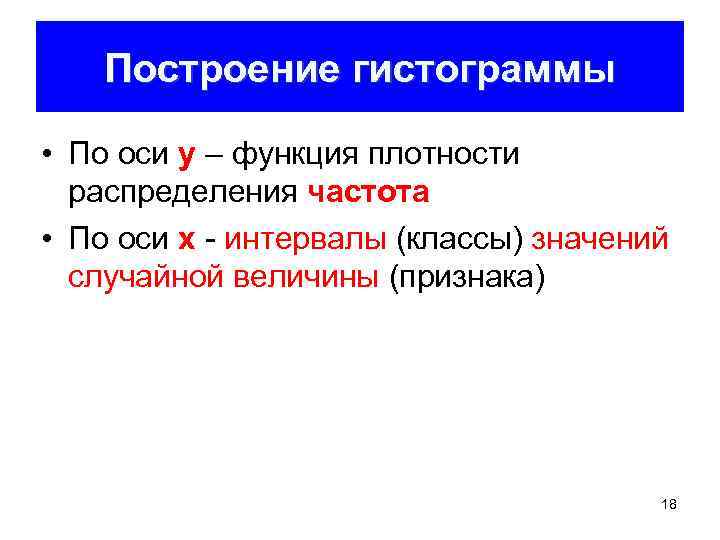 Построение гистограммы • По оси у – функция плотности распределения частота • По оси х - интервалы (классы) значений случайной величины (признака) 18