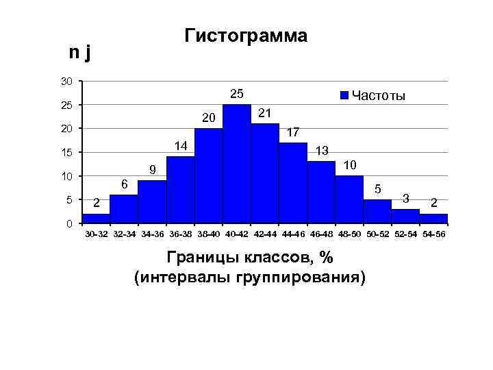 Гистограмма nj 30 25 25 20 20 14 9 10 0 21 17 15 5 Частоты 13 10 6 5 2 30 -32 32 -34 34 -36 36 -38 38 -40 40 -42 42 -44 44 -46 46 -48 48 -50 50 -52 52 -54 54 -56 Границы классов, % (интервалы группирования)