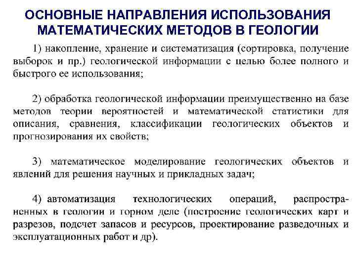ОСНОВНЫЕ НАПРАВЛЕНИЯ ИСПОЛЬЗОВАНИЯ МАТЕМАТИЧЕСКИХ МЕТОДОВ В ГЕОЛОГИИ