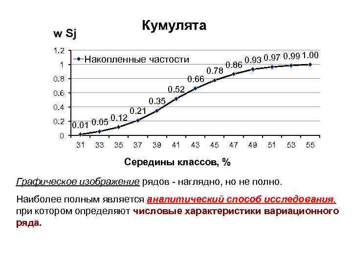 Кумулята w Sj 1. 2 1 Накопленные частости 0. 66 0. 8 0. 78 0. 86 0. 93 0. 97 0. 99 1. 00 0. 52 0. 6 0. 4 0. 05 0. 12 0. 01 0 31 33 35 0. 21 37 0. 35 39 41 43 45 47 49 51 53 55 Середины классов, % Графическое изображение рядов - наглядно, но не полно. Наиболее полным является аналитический способ исследования, при котором определяют числовые характеристики вариационного ряда.