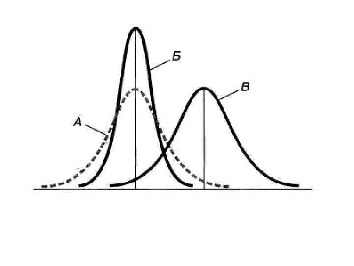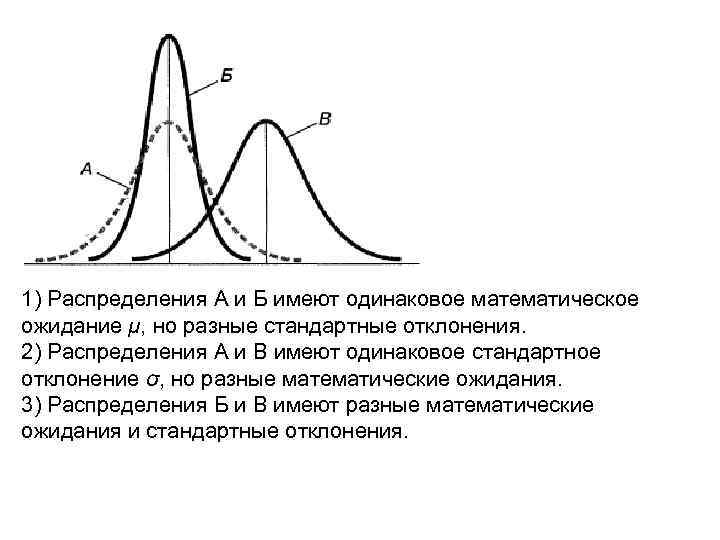 1) Распределения А и Б имеют одинаковое математическое ожидание μ, но разные стандартные отклонения. 2) Распределения А и В имеют одинаковое стандартное отклонение σ, но разные математические ожидания. 3) Распределения Б и В имеют разные математические ожидания и стандартные отклонения.