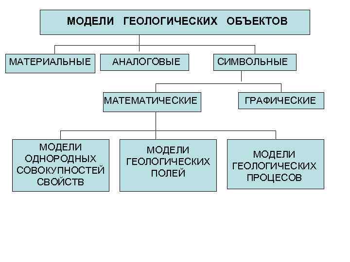 МОДЕЛИ ГЕОЛОГИЧЕСКИХ ОБЪЕКТОВ МОДЕЛИ ГЕОЛОГИЧЕСКИХ О АНАЛОГОВЫЕ МАТЕРИАЛЬНЫЕ МАТЕМАТИЧЕСКИЕ МОДЕЛИ ОДНОРОДНЫХ СОВОКУПНОСТЕЙ СВОЙСТВ МОДЕЛИ ГЕОЛОГИЧЕСКИХ ПОЛЕЙ СИМВОЛЬНЫЕ ГРАФИЧЕСКИЕ МОДЕЛИ ГЕОЛОГИЧЕСКИХ ПРОЦЕСОВ