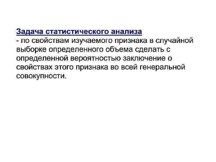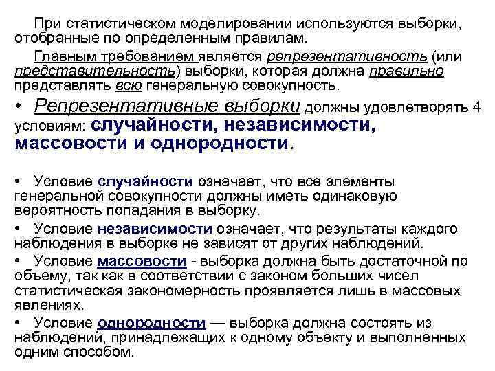 При статистическом моделировании используются выборки, отобранные по определенным правилам. Главным требованием является репрезентативность (или представительность) выборки, которая должна правильно представлять всю генеральную совокупность. • Репрезентативные выборки должны удовлетворять 4 условиям: случайности, независимости, массовости и однородности. • Условие случайности означает, что все элементы генеральной совокупности должны иметь одинаковую вероятность попадания в выборку. • Условие независимости означает, что результаты каждого наблюдения в выборке не зависят от других наблюдений. • Условие массовости - выборка должна быть достаточной по объему, так как в соответствии с законом больших чисел статистическая закономерность проявляется лишь в массовых явлениях. • Условие однородности — выборка должна состоять из наблюдений, принадлежащих к одному объекту и выполненных одним способом.