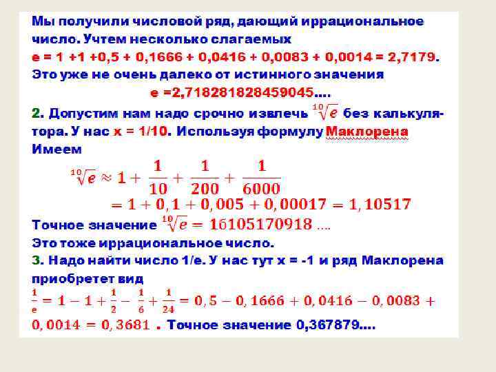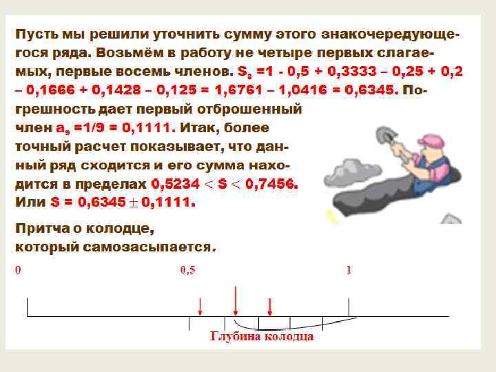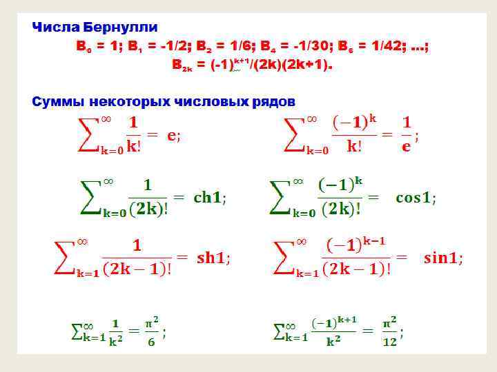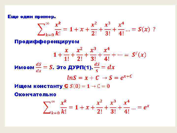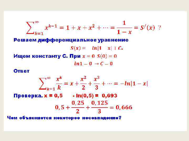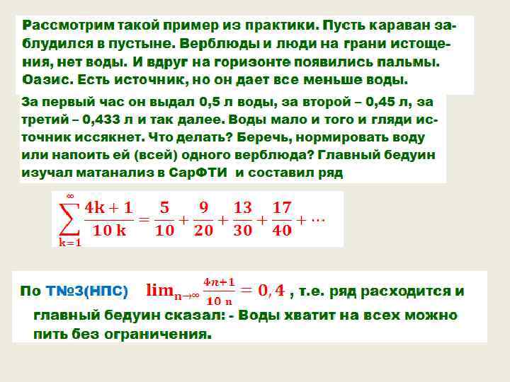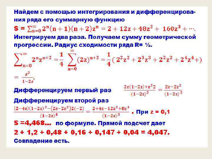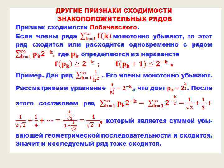 Примеры рядов = . Последний ряд есть, знакомая еще со школьной поры, сумма бесконечно убывающей геометрической последовательности.