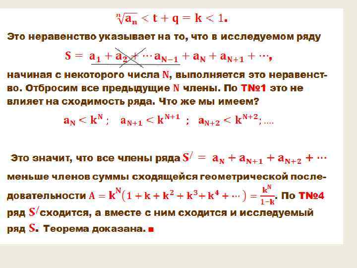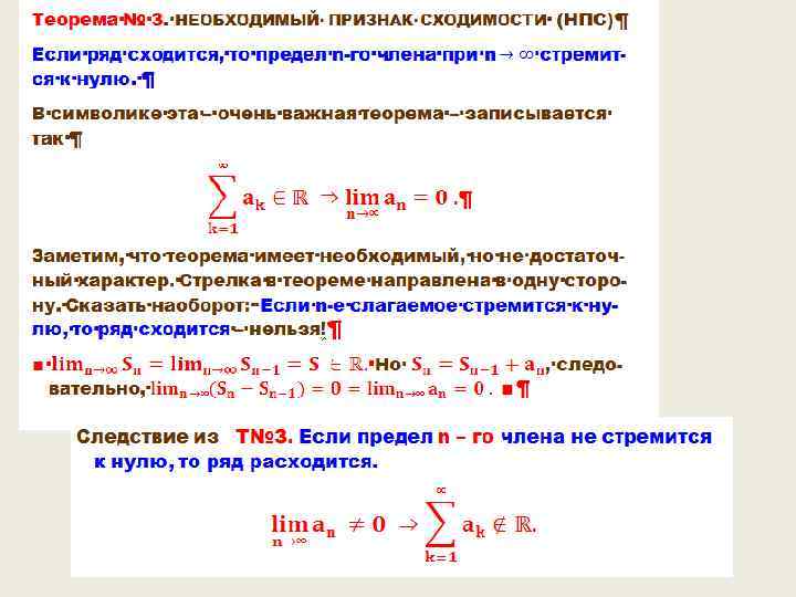 Сходимость ряда Это самая главная характеристика ряда, она указывает конечна сумма ряда – ряд сходится, или эта сумма не существует или бесконечна- ряд расходится. Если , то ряд сходится. Другими словами, если предел частичной суммы конечное число, то бесконечная сумма ряда дает это число. Если , то ряд расходится. Другими словами, ряд дает бесконечность или вообще не существует. Реально работать можно только со сходящимися рядами.