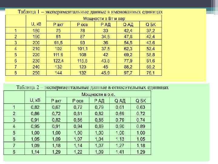 • Все величины приведены в относительных единицах. • Исходные данные (результаты эксперимента):