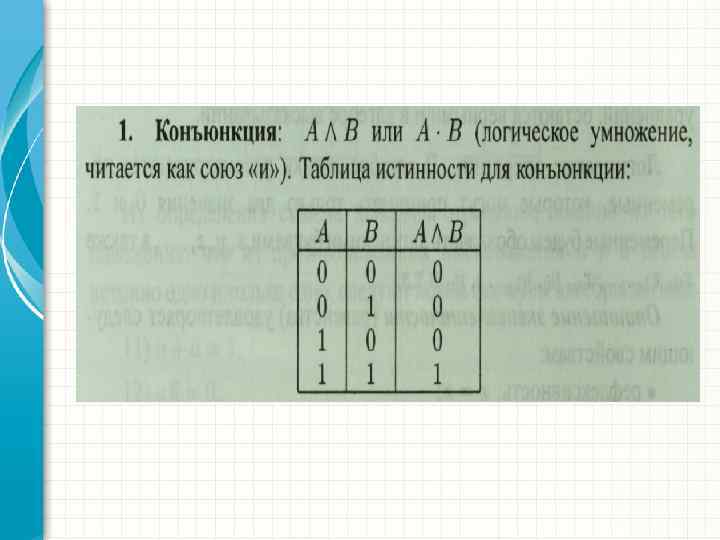 В алгебрі логіки «множення» називається кон'юнкцією і позначається особливим знаком ˄. Добуток а • b двох висловлювань а і b є складним висловленням. Воно вважається істинним (рівним одиниці) тоді і тільки тоді, коли обидва співмножники істинні, і хибним (рівним нулю), якщо хоч один з співмножників хибний. Це визначення добутку відповідає звичайній арифметиці: 1 х1 = 1; 1 х0 = 0 х1 = 0; 0 х0 = 0.