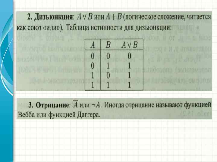 В алгебрі логіки «сума» а + Ь називається диз'юнкцією і знак + позначається знаком V (першою літерою латинського слова «vel» - або). Сума двох висловлювань вважається хибною і рівною нулю тоді і тільки тоді, коли обидва доданки хибні, тобто 0 + 0 = 0.