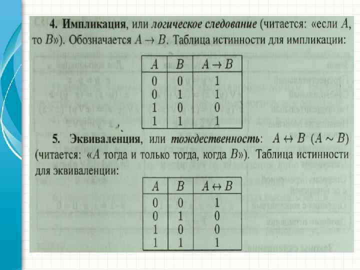 Логічні операції. В алгебрі логіки розглядаються змінні, які можуть приймати тільки два значення 0 і 1. Змінні позначають латинськими буквами x, y, z, . . . , а також х1, x 2 … Відношення еквівалентності (рівності) задовольняє наступним властивостям: • рефлексивність: х = х; • симетричність: якщо х = у, то у = х; • транзитивність: х = у і у = z, то х = z; звідси випливає принцип: якщо х = у, то в будь-якій формулі, яка містить х, замість х можна підставити y, і в результаті буде отримана еквівалентна формула.