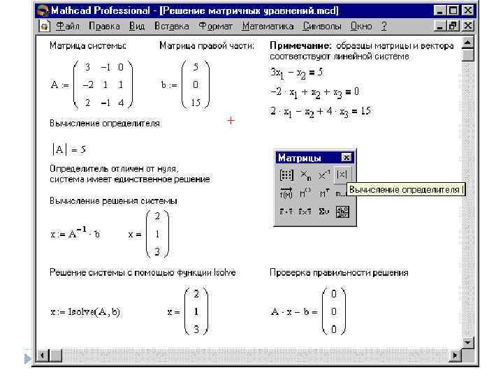2. 5. Розв’язок систем рівнянь Math. CAD дає можливість розв’язувати також і системи рівнянь. Максимальне число рівнянь і змінних дорівнює 50. Результатом розв’язання системи буде чисельне значення шуканого кореня.