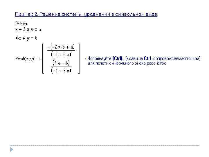 Щоб розв’язати систему рівнянь у символьному вигляді, необхідно виконати наступне: - надрукувати ключове слово Given. - надрукувати рівняння в будь-якому порядку нижче слова Given. Впевнитися, що для введення знаку = використовується [Ctrl]=. - надрукувати функцію Find, що відповідає системі рівнянь. - натиснути [Ctrl]. (клавіша CTRL, супроводжувана крапкою). Mathcad відобразить символьний знак рівності . - клацнути мишею на функції Find.
