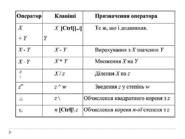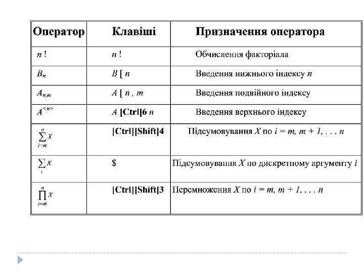 У таблиці використовуються наступні позначення: X і Y - змінні чи вираз будь-якого типу; x і y - дійсні числа; z і w - дійсні чи комплексні числа; m і n - цілі числа; A і B - масиви (вектори чи матриці); i - дискретний аргумент; t - будь-яка змінна; f - будь-яка функція.