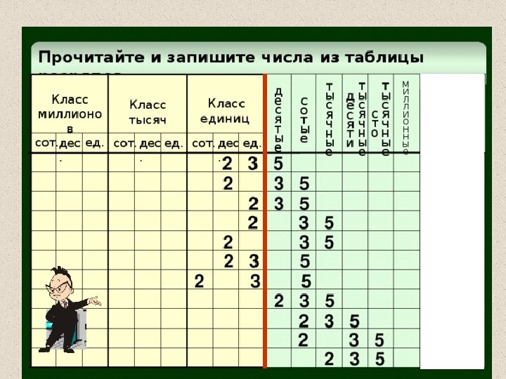 Прочитайте числа, записанные в таблице разрядов, и запишите их. Класс миллионов сот. дес. ед. Класс тысяч Класс единиц сот. дес. ед. сот. дес. 2 3 7 5 4 7 2 3 5 4 1 1 ед. 1 8 9 6