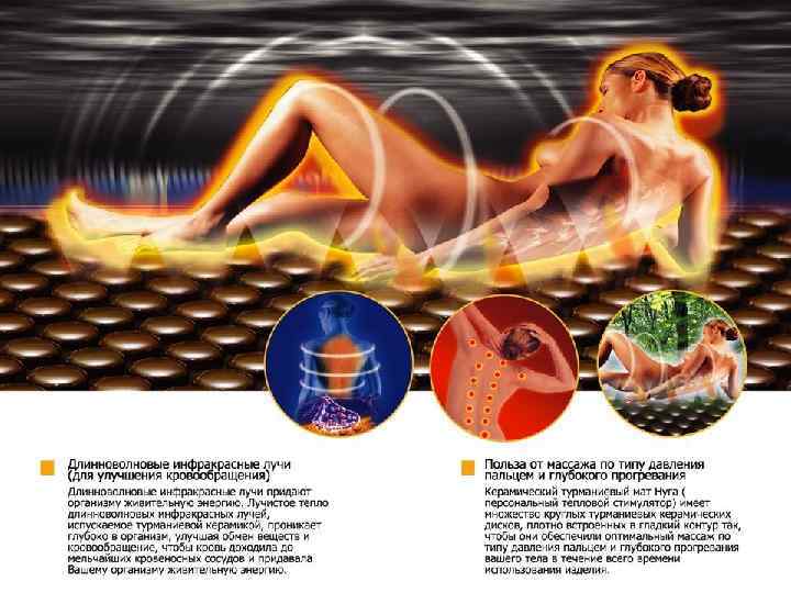 Точечный массаж по типу давления пальцем Керамический турманиевый мат имеет множество круглых турманиевых керамических дисков, плотно встроенных в гладкий контур так, чтобы они обеспечивали оптимальный массаж по типу давления пальцем.