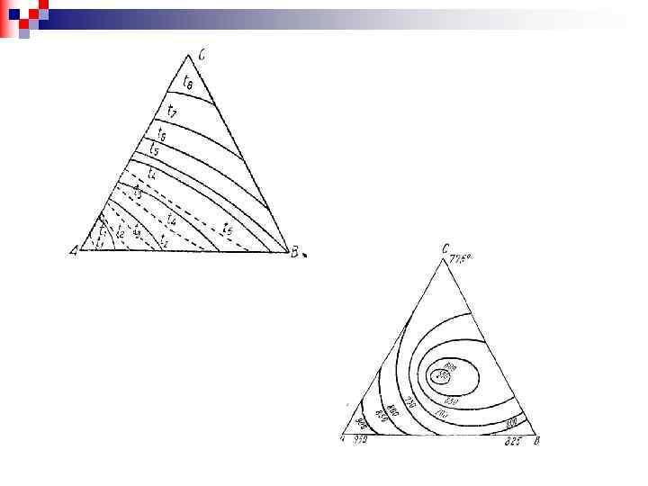 Обычно сплавы содержат по три, по четыре и более компонентов. О свойствах тройного сплава нельзя судить по свойствам двойных сплавов. В тройных сплавах влияние добавок двух компонентов никогда не является простой суммой влияния этих добавок. Часто два добавленных компонента реагируют друг с другом и дают новое химическое соединение, что придает новые свойства тройному сплаву. Еще чаще третий добавляемый компонент изменяет растворимость второго компонента в первом, то уменьшая ее, то увеличивая. А с изменением растворимости одного компонента в другом тесно связано изменение физических и механических свойств. Фазовое равновесие в системе из трех компонентов А, В и С при всех составах тройных сплавов можно определить, если изучено равновесие в двойных системах А - В, В - С и С - А. Состав тройных сплавов характеризуется тремя переменными концентрациями, из которых две любые являются независимыми переменными, а третья определяется дополнением суммы двух первых до 100%.