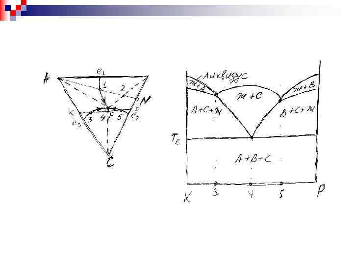 Пользуясь проекцией диаграммы на концентрационный треугольник и правилом центра тяжести, можно определить количество каждой структурной составляющей в любом сплаве. Например, в сплаве состава х количество избыточной фазы А определяется отношением отрезков ху : Ау. Отношением Ах : Ау определяется количество жидкой фазы состава у, оставшейся к концу выпадения избыточной фазы А. Из этой жидкости выпадает двойная и тройная эвтектики. Поэтому точка у характеризует средний состав смеси этих эвтектик. Состав тройной эвтектики известен (Е), и следовательно, можно определить средний состав двойной эвтектики. Этому составу соответствует точка k на стороне АВ концентрационного треугольника. Построив треугольник Ak. E, вершины которого дают состав структурных составляющих (А, А + В и А + В + С), можно, пользуясь правилом центра тяжести, определить количество каждой из них. Количество А определяется отношением длин ху : Ау, двойной эвтектики (А + В) - lx : lk, тройной эвтектики (А + В + С) - отношением mx : m. E. Точка m характеризует средний состав смеси из А и (А + В), точка l - смеси из А и (А + В + С), точка y - смеси из (А + В) и (А + В + С).