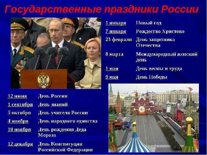 Праздники в России • Нерабочие праздничные дни в России — дополнительные выходные дни, связанные с праздниками. • Помимо нерабочих праздничных дней, в России установлены рабочие праздничные дни — праздники, не являющиеся дополнительными выходными, но в которые проводятся торжественные мероприятия. Устанавливаются также дни памяти. В День памяти и скорби 22 июня в учреждениях культуры, на телевидении и радио отменяются развлекательные мероприятия и передачи в течение всего дня. • Профессиональные праздники устанавливаются в знак признания заслуг работников отраслей народного хозяйства и различных сфер деятельности. • Памятные дни устанавливаются в честь значительных событий и знаменательных дат в мировой истории или истории России. • Дни воинской славы (победные дни) России устанавливаются в ознаменование славных побед российских войск, сыгравших решающую роль в истории России. • Памятные даты России — официально установленные памятные даты в истории Отечества, связанные с важнейшими историческими событиями в жизни государства и общества. • https: //ru. wikipedia. org/wiki/%D 0%9 F%D 1%80%D 0%B 7%D 0%B 4%D 0%BD%D 0%B 8% D 0%BA%D 0%B 8_%D 0%A 0%D 0%BE%D 1%81%D 0%B 8