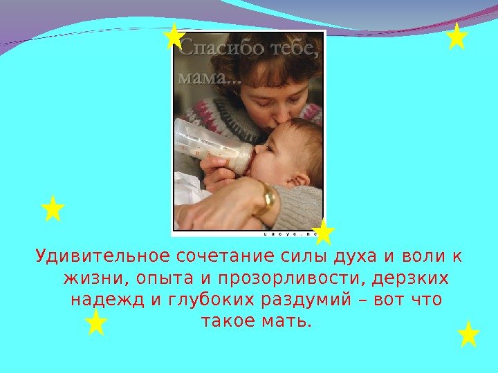 Удивительное сочетание силы духа и воли к жизни, опыта и прозорливости, дерзких надежд и глубоких раздумий – вот что такое мать.