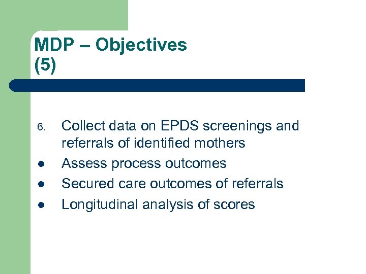 MDP – Objectives (5) 6. l l l Collect data on EPDS screenings and referrals of identified mothers Assess process outcomes Secured care outcomes of referrals Longitudinal analysis of scores