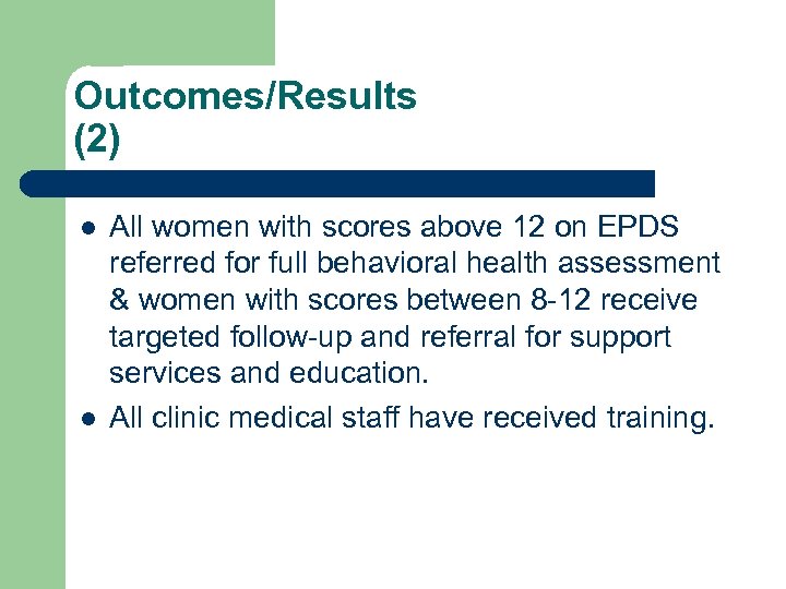 Outcomes/Results (2) l l All women with scores above 12 on EPDS referred for full behavioral health assessment & women with scores between 8 -12 receive targeted follow-up and referral for support services and education. All clinic medical staff have received training.