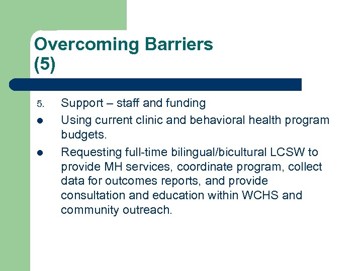 Overcoming Barriers (5) 5. l l Support – staff and funding Using current clinic and behavioral health program budgets. Requesting full-time bilingual/bicultural LCSW to provide MH services, coordinate program, collect data for outcomes reports, and provide consultation and education within WCHS and community outreach.