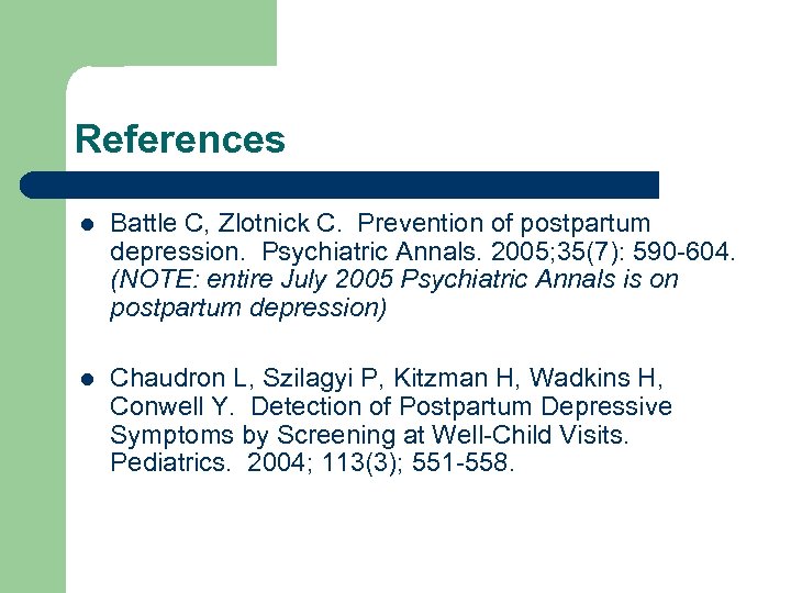References l Battle C, Zlotnick C. Prevention of postpartum depression. Psychiatric Annals. 2005; 35(7): 590 -604. (NOTE: entire July 2005 Psychiatric Annals is on postpartum depression) l Chaudron L, Szilagyi P, Kitzman H, Wadkins H, Conwell Y. Detection of Postpartum Depressive Symptoms by Screening at Well-Child Visits. Pediatrics. 2004; 113(3); 551 -558.