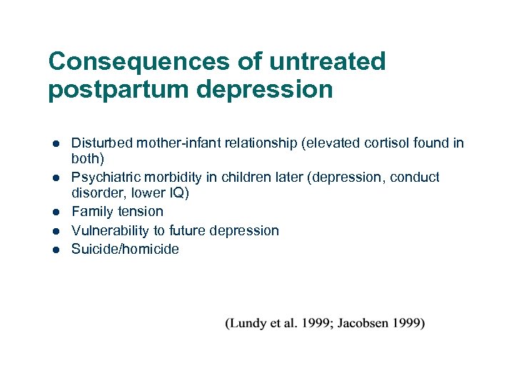 Consequences of untreated postpartum depression l l l Disturbed mother-infant relationship (elevated cortisol found in both) Psychiatric morbidity in children later (depression, conduct disorder, lower IQ) Family tension Vulnerability to future depression Suicide/homicide