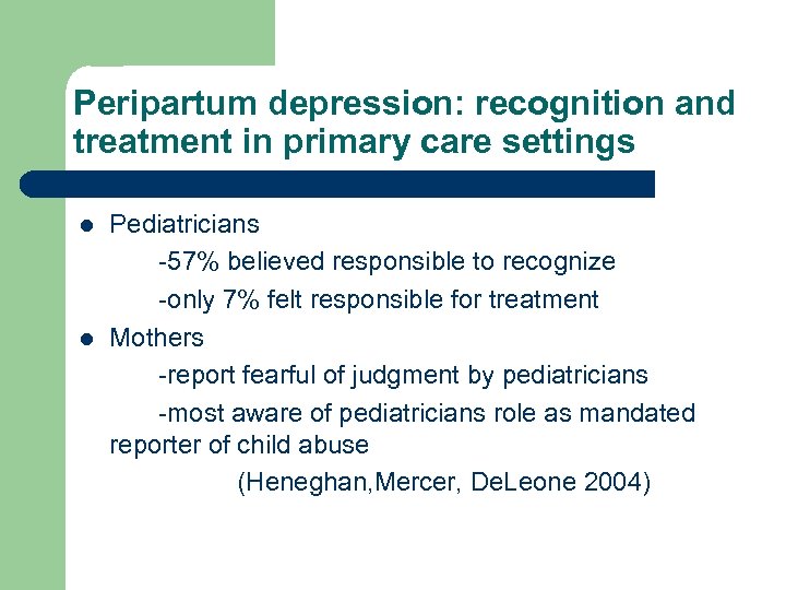 Peripartum depression: recognition and treatment in primary care settings l l Pediatricians -57% believed responsible to recognize -only 7% felt responsible for treatment Mothers -report fearful of judgment by pediatricians -most aware of pediatricians role as mandated reporter of child abuse (Heneghan, Mercer, De. Leone 2004)